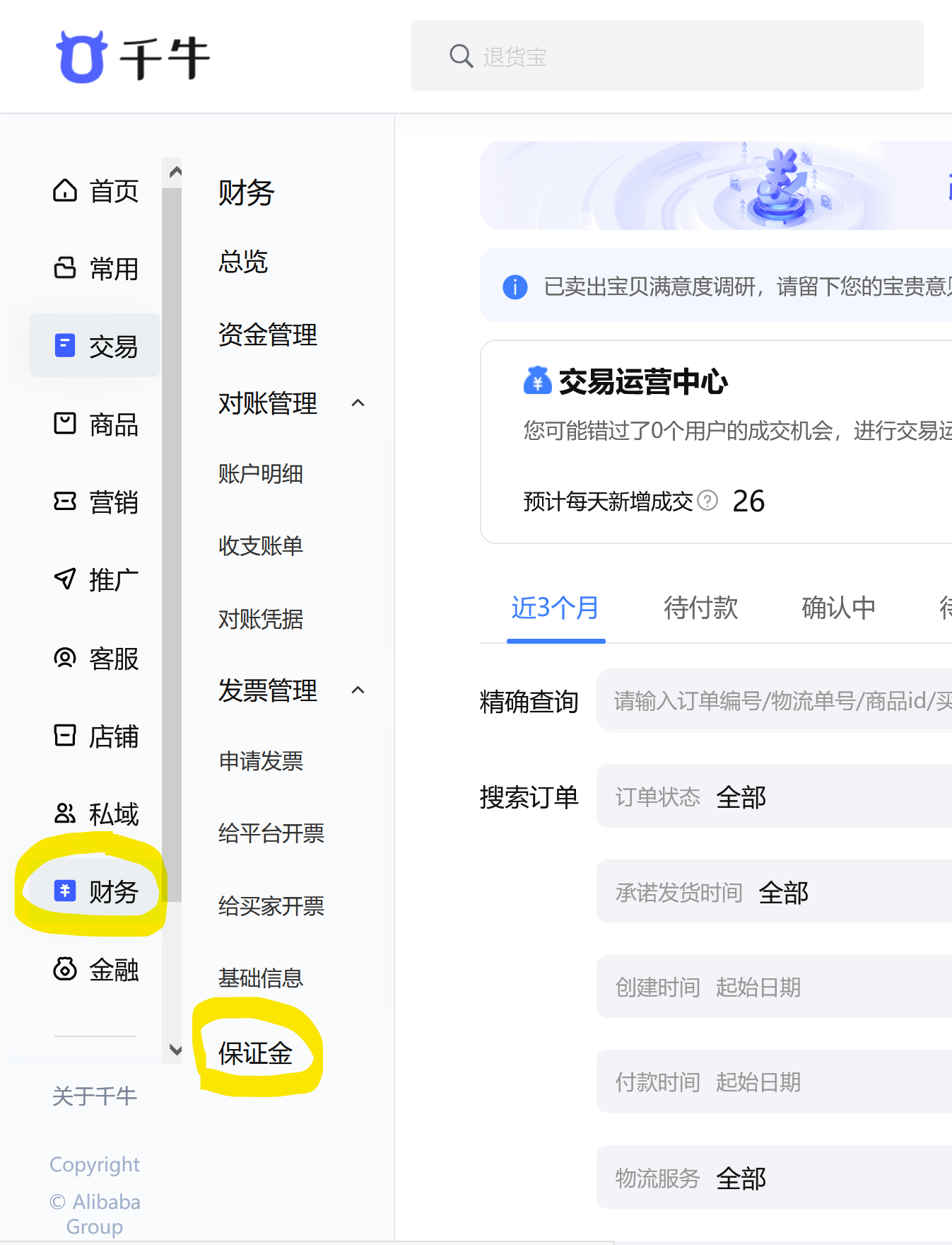 在左侧下菜单中往下滚动,“财务”-“保证金”